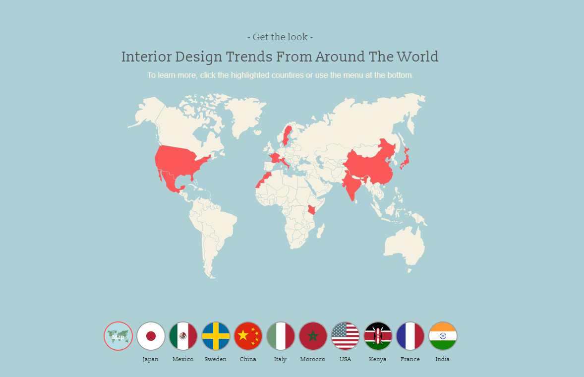 Vibrant Doors uses an eyecatching dynamic map as the entrance gate to a rich interactive experience of interior design trends around the world. A click on the map will lead you to another interactive page about design trends in the country you chose. It’s quite enchanting, don’t you think?