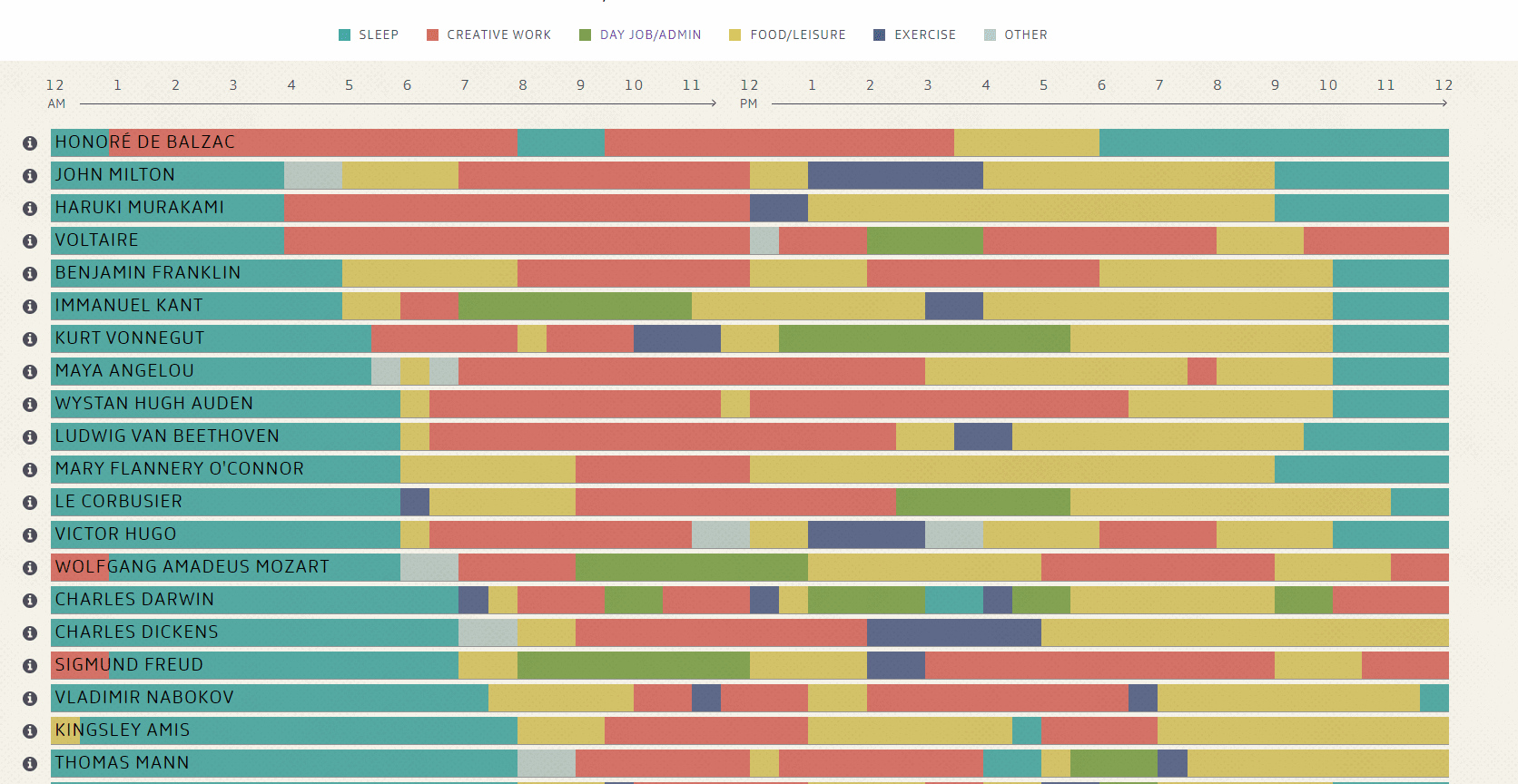 You could even create an Infographic like this Padio.com infographic. It shows you the daily routine of famous creative people and lets you filter their schedules according to your interest.