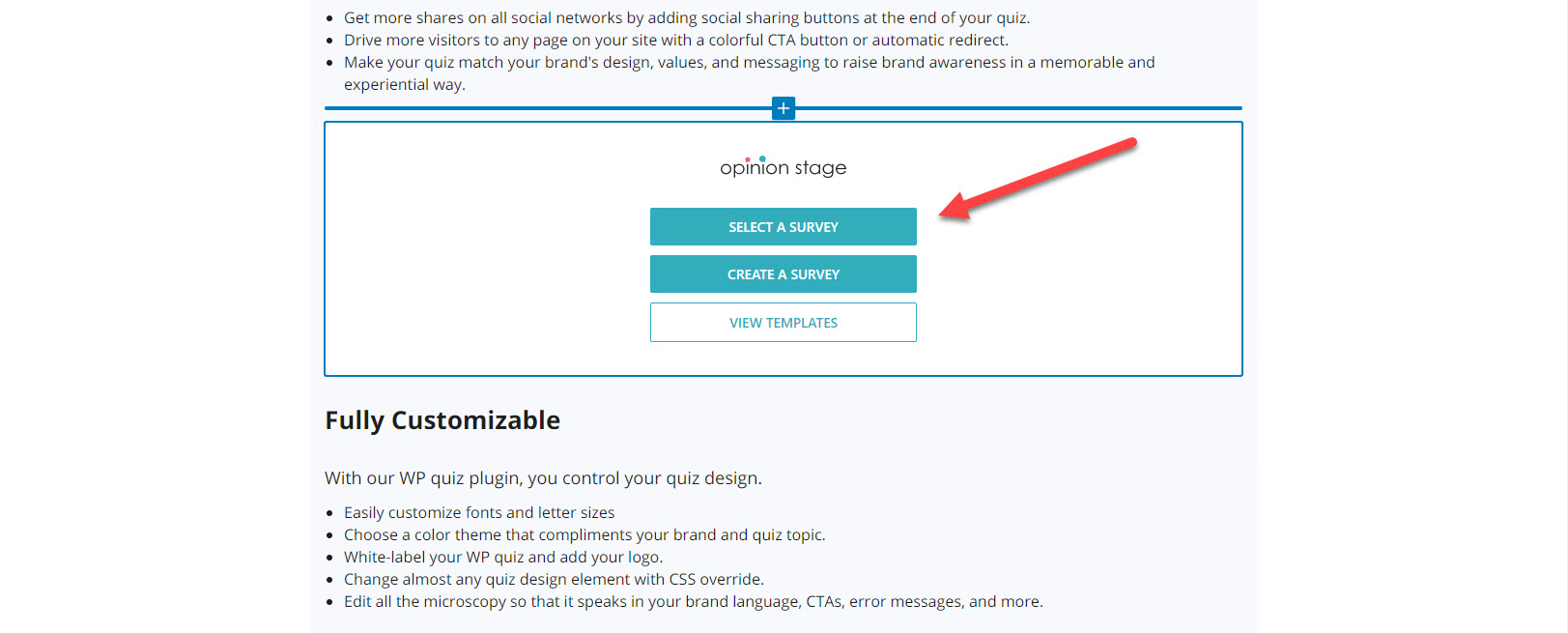Click on “Select a Survey” to choose the one you want to add to your site. If you haven’t created one yet, you can do so by clicking on the “Create a Survey” button.