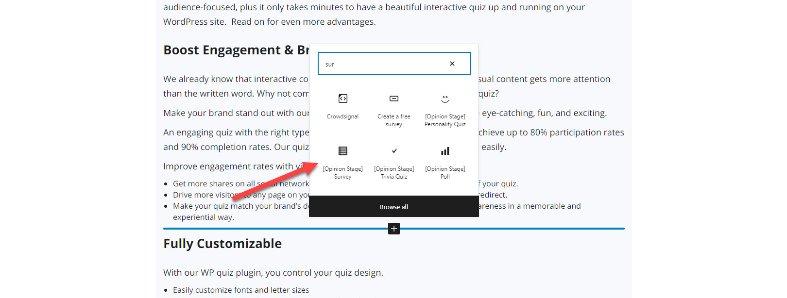 Add a new block by clicking on “+” and search for Opinion Stage Survey maker.