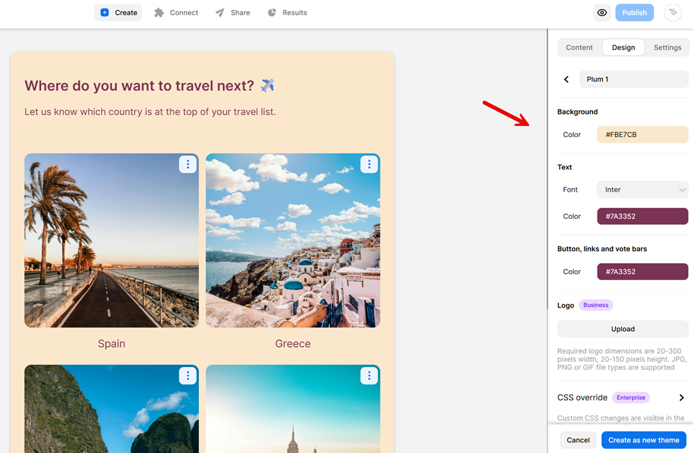 Design customization is available through pre-built themes, or you can create your own. You can modify background colors, text styles, vote bar colors, and even upload a brand logo.