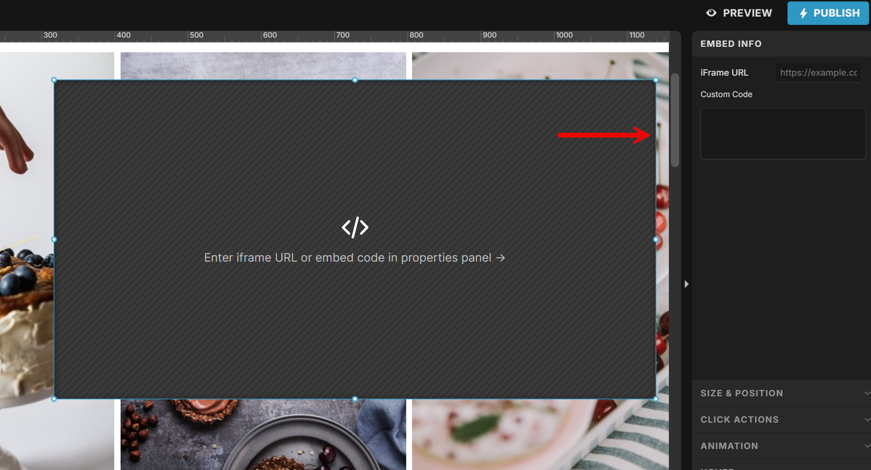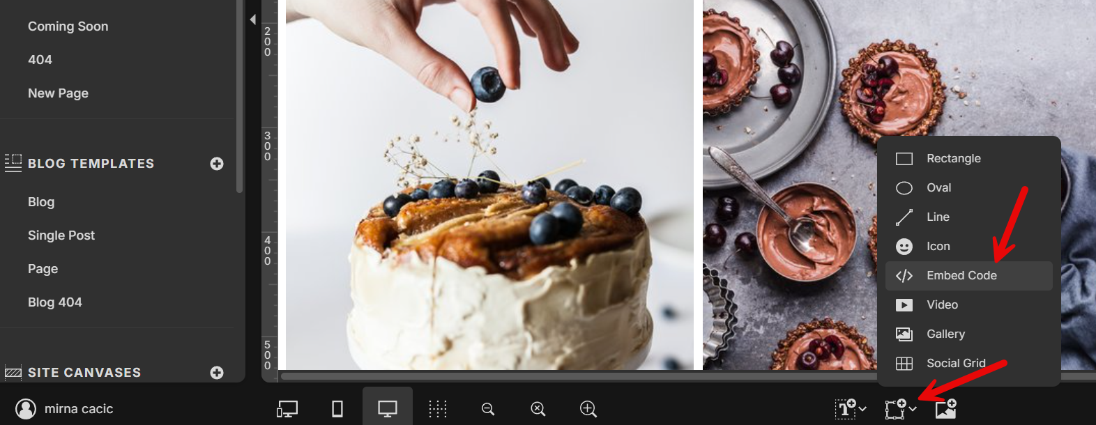 To activate the page editing options, click on your page first, then select the picture frame icon that’s at the bottom of your screen. Then, choose ‘Embed Code.’