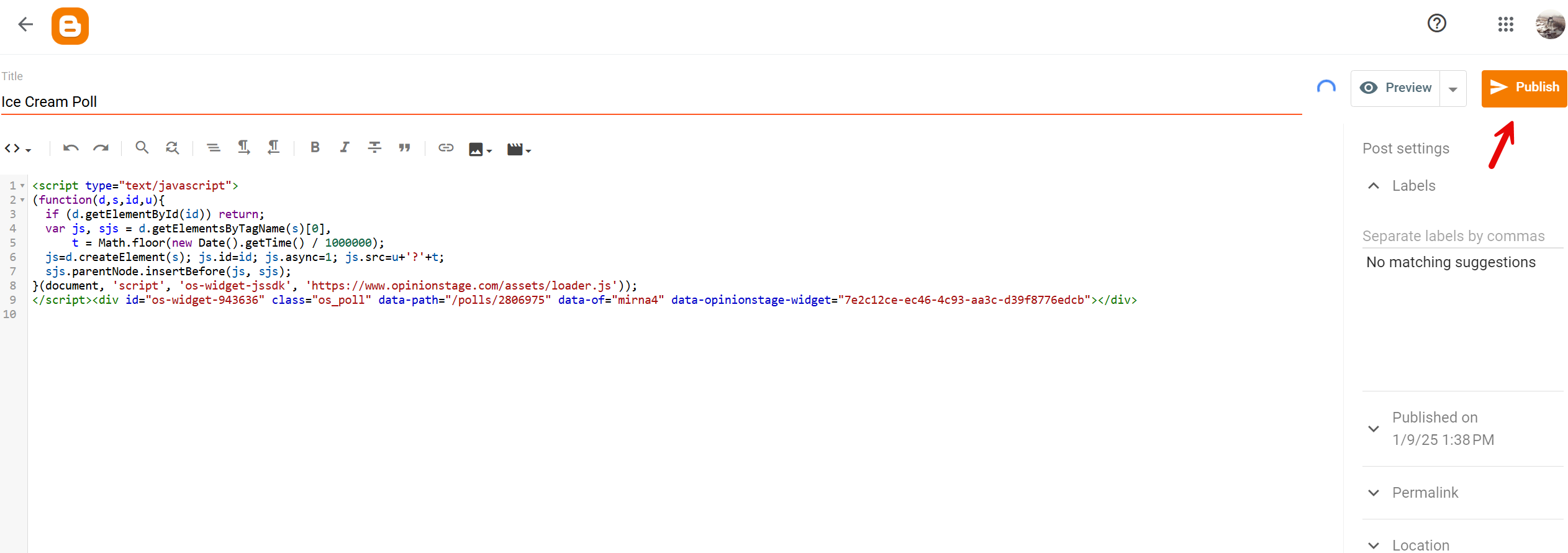 Paste the script code you copied into the body of the post and click on ‘Preview’ or ‘Publish’.