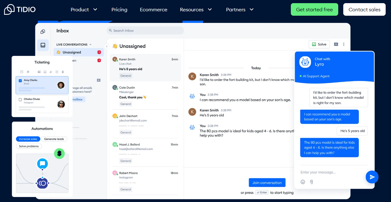 Tidio is a customer communication platform that combines live chat, AI-powered chatbots, automated workflows, and helpdesk ticketing software. It integrates with tools like Shopify, WordPress, and Facebook Messenger, helping you to improve customer support, engage visitors in real-time, and increase conversions.