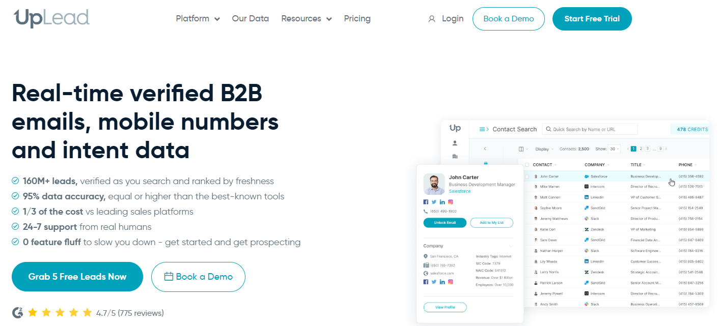 UpLead is a B2B lead generation platform that gives you access to verified business contacts, helping you find the right leads for your business. With features like real-time email verification, data enrichment, and CRM integration, UpLead streamlines your sales prospecting efforts. Backed by a 95% data accuracy guarantee, it ensures you have reliable, high-quality information to make your outreach more effective.