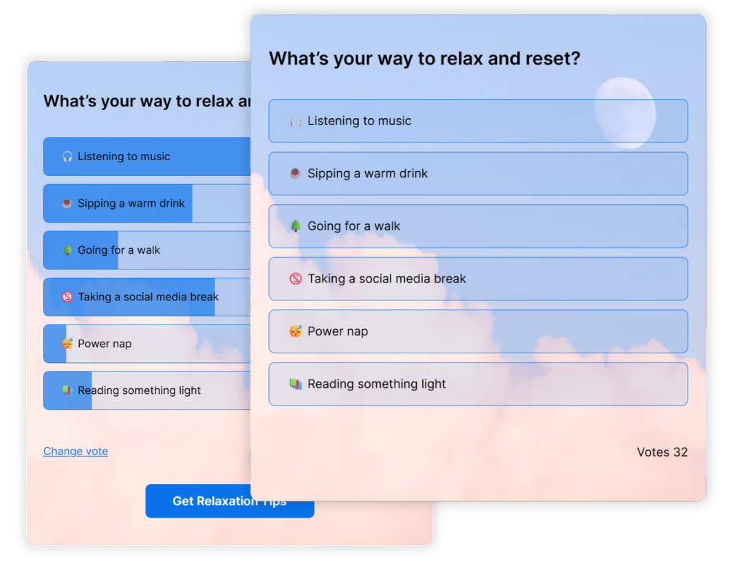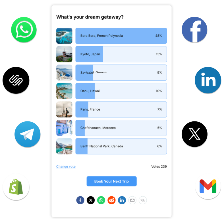 Your poll will look great and perform well in a story, feed, inbox, or on your site. Our polls are mobile-friendly and work on any device.